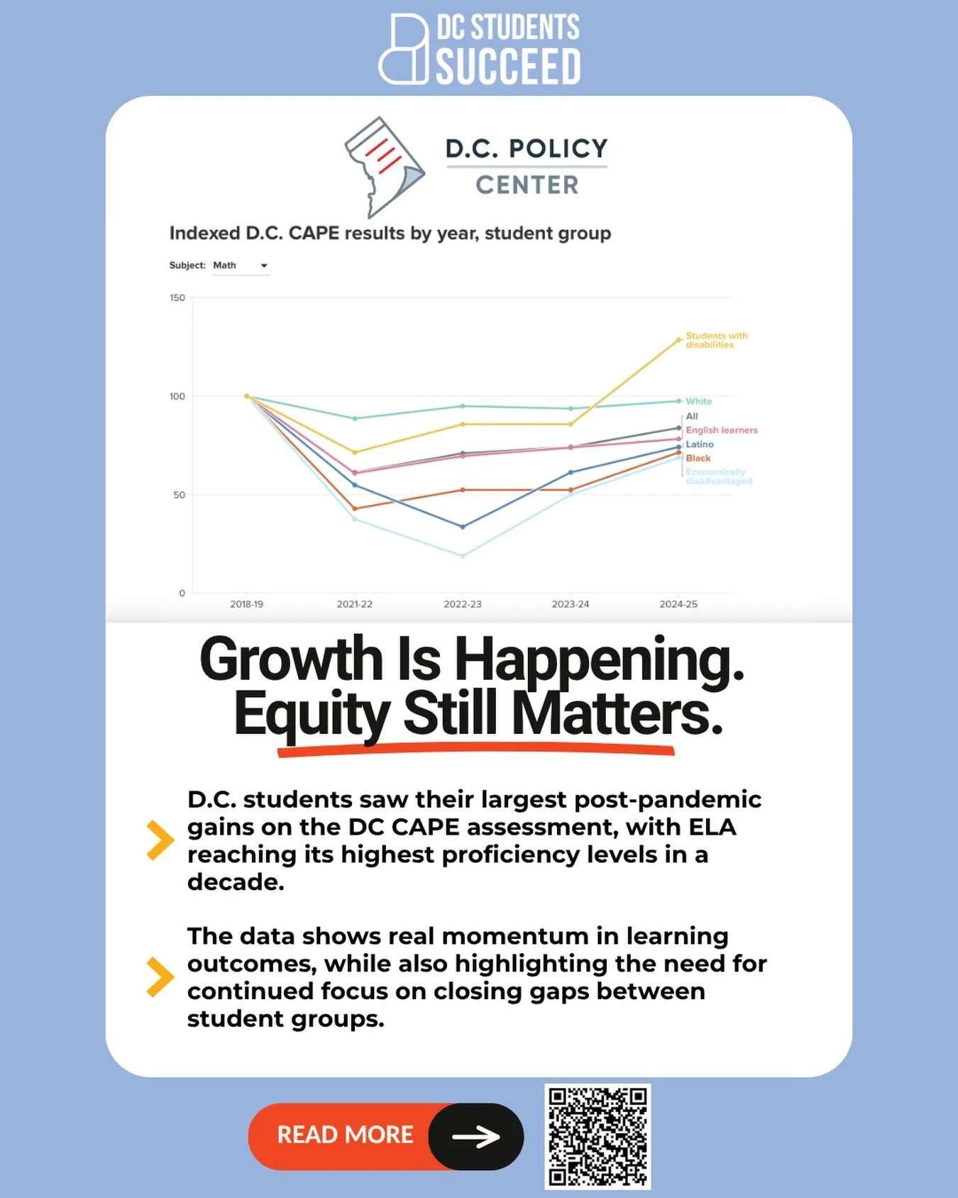 DC Students Succeed brings together individuals — students, families, DC residents — and organizations in support of creating excellent and equitable public schools for all students. We believe that students come first and that their needs must be at the center of our work. We work in service of students, especially Black and brown students.